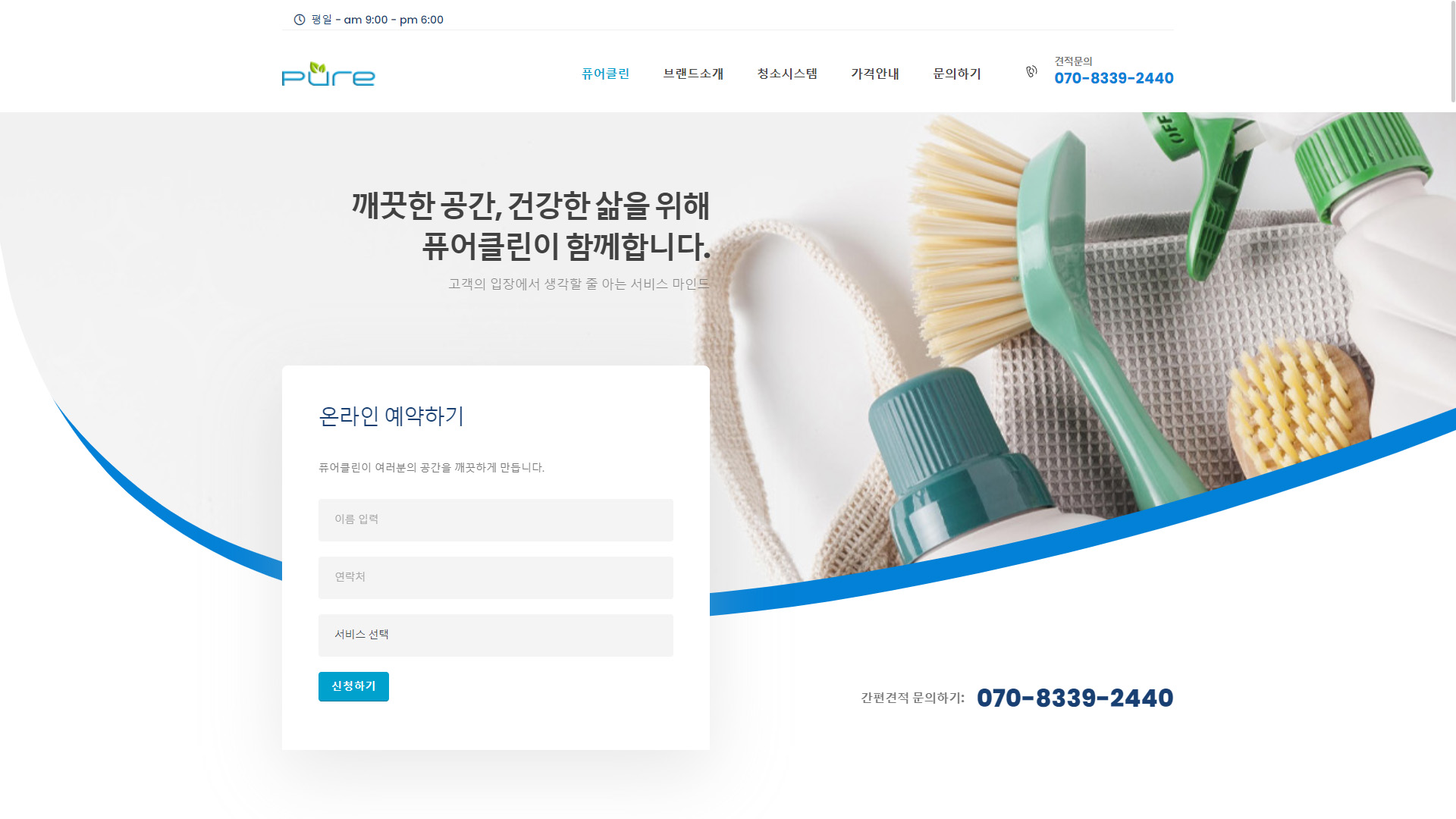 Pure Clean 청소업체 사이트는 사용자 친화적인 디자인으로