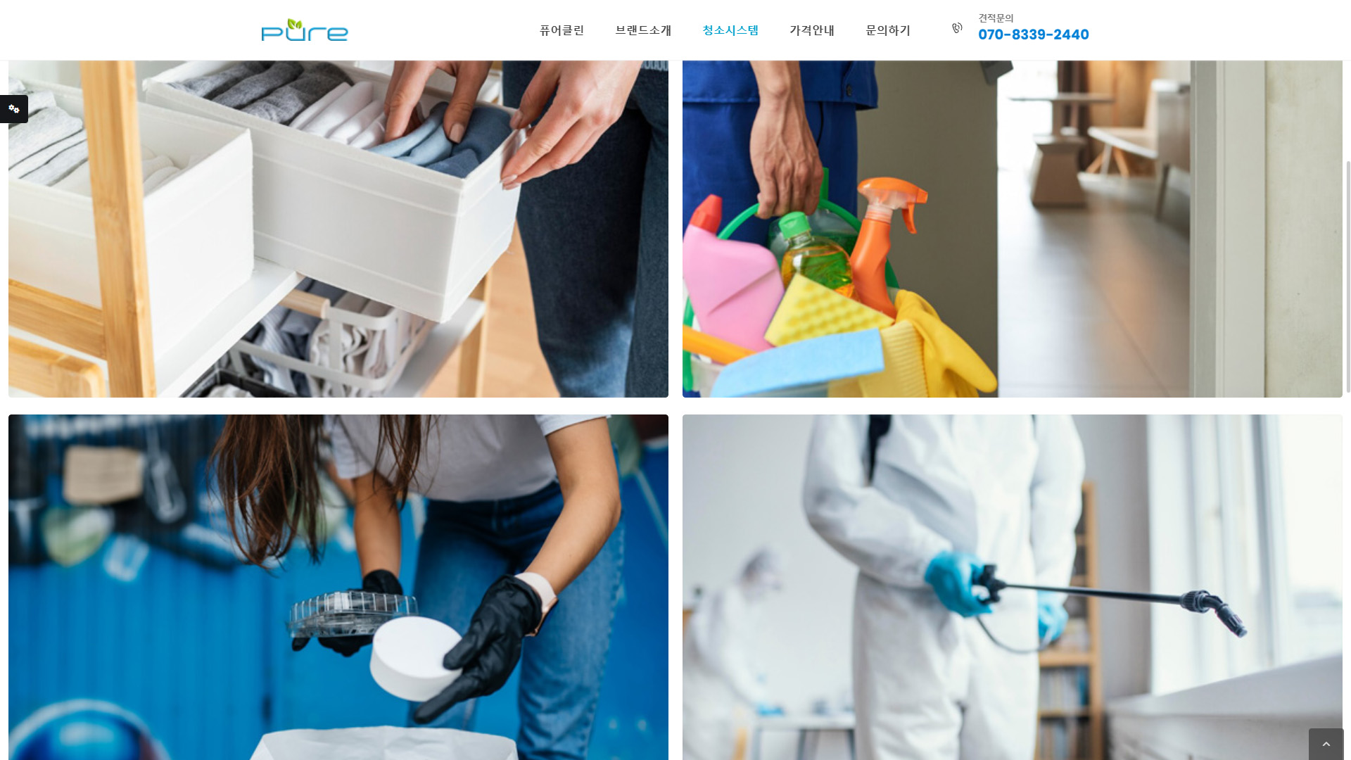 Pure Clean 청소업체 사이트는 사용자 친화적인 디자인을 갖춰 사용자가 쉽게 정보를 찾고 예약할 수 있도록 간편한 인터페이스를 제공하였습니다.