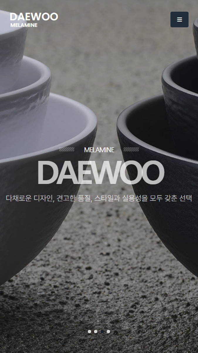 Daewoo Melamine 사이트는 사용자의 이용이 편리하도록 설계하였으며 멜라닌제품 특장점을 어필하고 신제품을 실시간 업데이트 할 수 있도록 프로그램을 구축하였습니다.